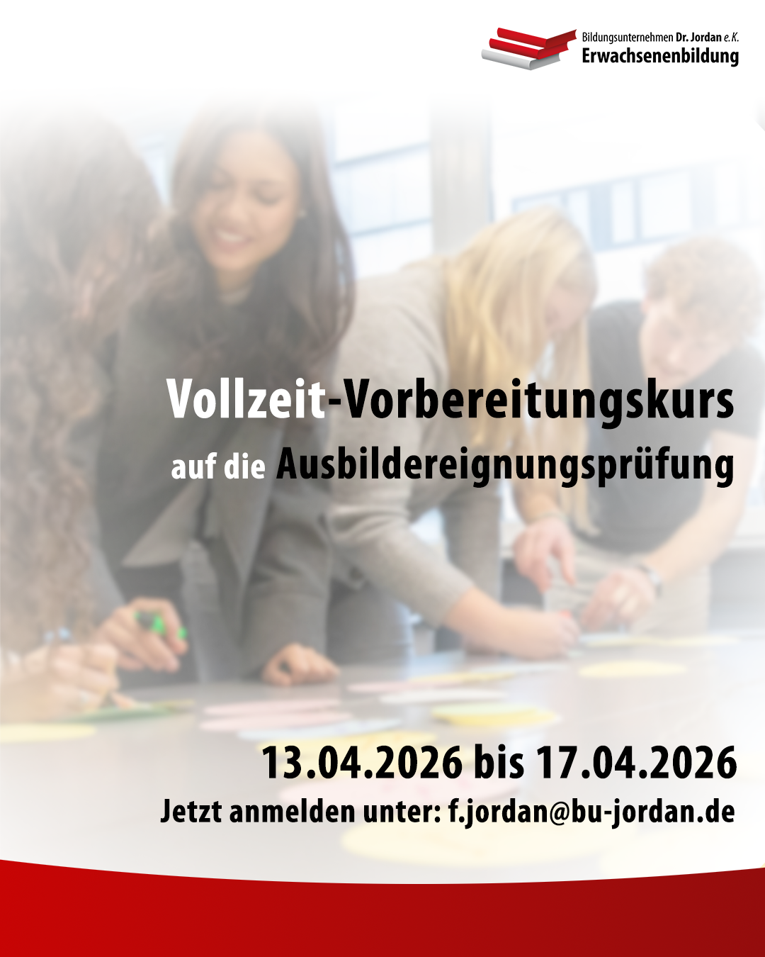 Vom 13.04.26 bis 17.04.26 bieten wir Ihnen einen intensiven Vollzeit-Vorbereitungslehrgang an, in dem Sie innerhalb von nur fünf Tagen optimal und praxisorientiert auf die IHK-Ausbildereignungsprüfung vorbereitet werden.